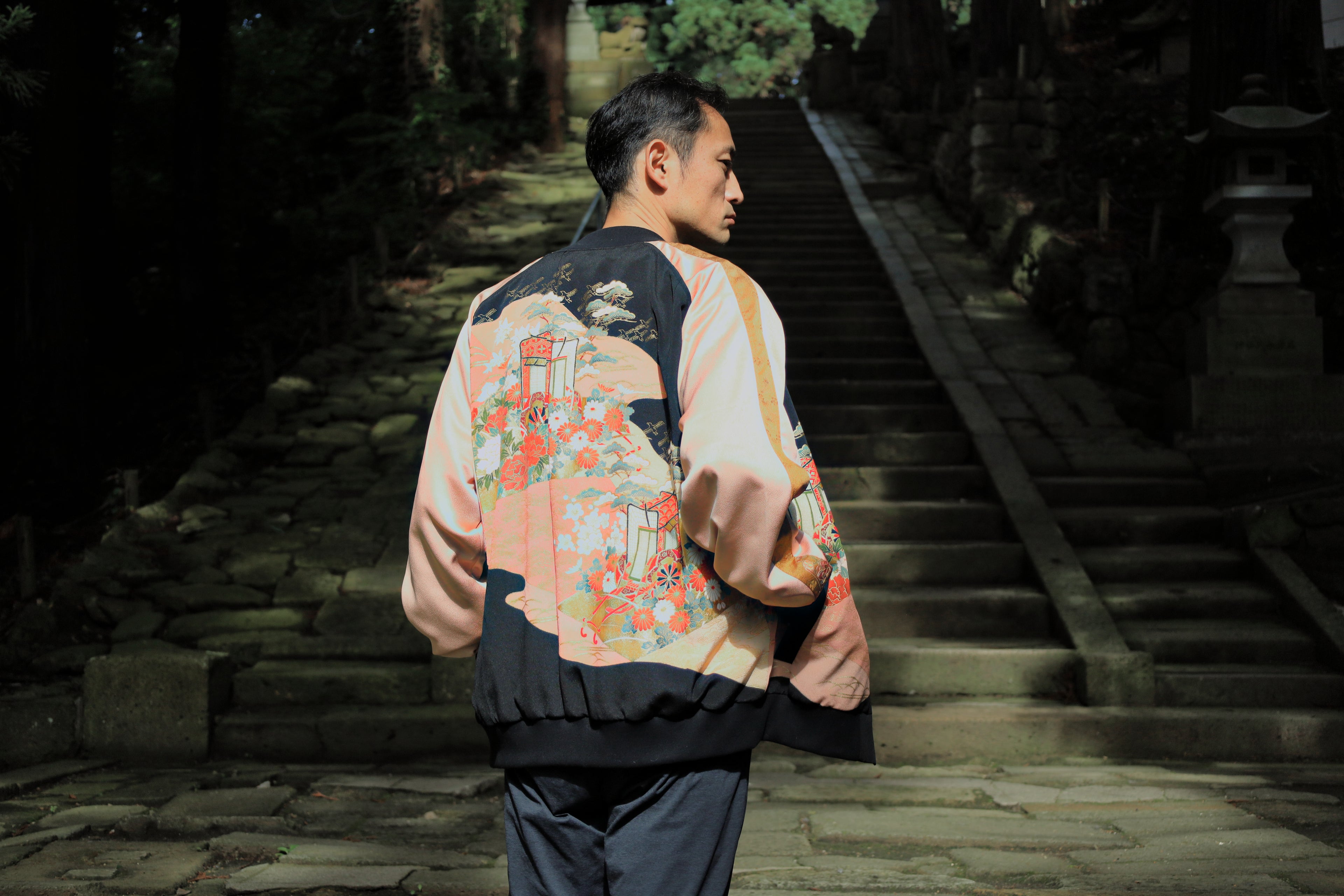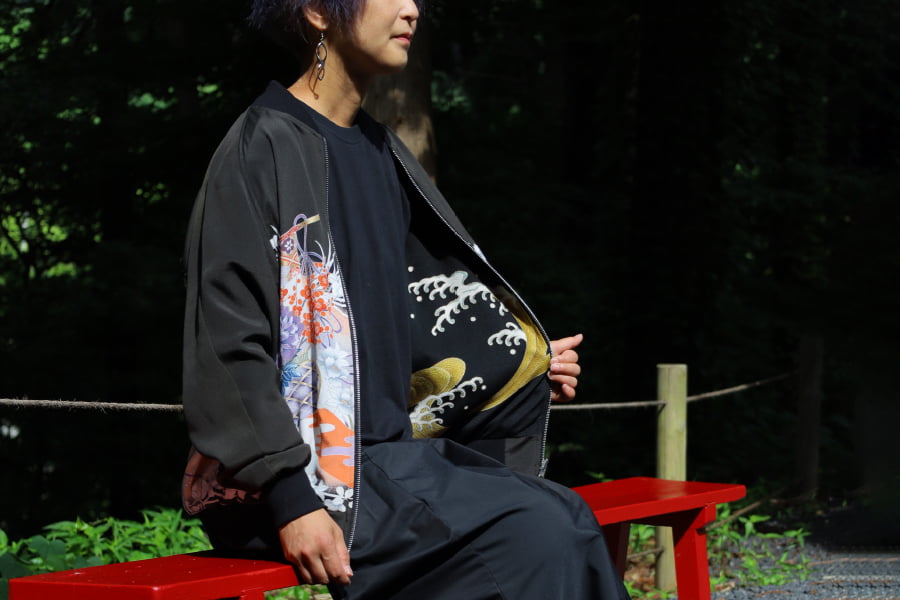 一点物として制作されている着物リメイクジャケットは、他にはない独自の個性とスタイルをもっています。伝統的なデザインを持つ優雅さと、現代的なカットやシルエットが融合し、まさに唯一無二のファッションアイテムとなります。
